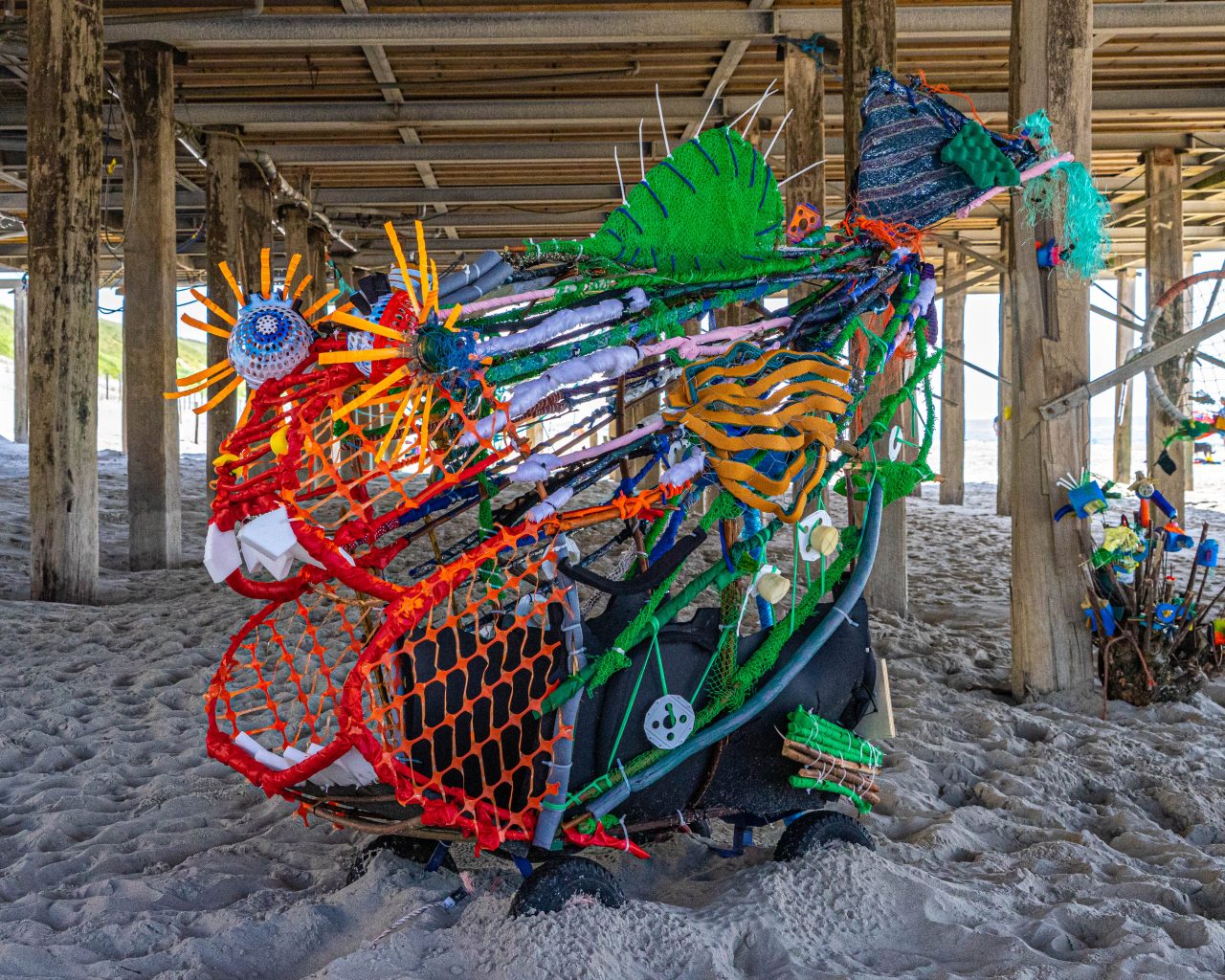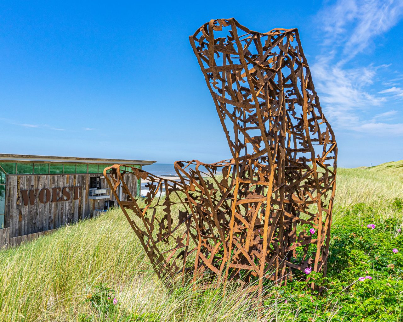 In juni zijn de strandpaviljoens in de Kop van Noord-Holland bovendien op een leuke manier met elkaar verbonden: door de ku(n)stroute Zijpe aan Zee. Deze kunstroute loopt van de Groote Keeten tot Petten aan Zee. Bij iedere strandtent kun je stoppen om daar de kunst te bekijken. Sommige werken vond ik niet heel bijzonder. Maar er zaten wel een paar toffe exemplaren tussen. Bij de strandpaviljoenen staat uitleg over de kunst én het programma. Zo was er een kunstenares die van gerecycled materiaal kunstwerken in de vorm van zeedieren maakte. Best tof!