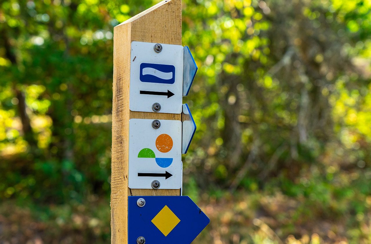 De wandelroute staat aangegeven met een wit golfje en een blauwe achtergrond als markering. De markering is duidelijk aangegeven op bomen en borden en je kunt eigenlijk bijna niet verkeerd lopen. Bij splitsingen staat er vaak een pijltje bij, zodat je weet welke kant je op moet gaan. Hierdoor maakt het ook niet uit wat jouw startpunt is: je kunt de wandeling van noord naar zuid lopen of juist andersom.