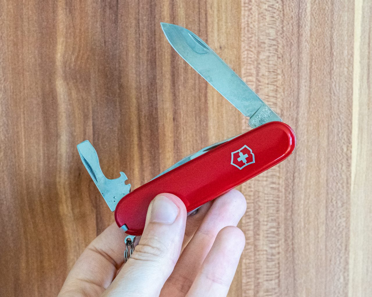 Zelf heb ik een multitool van Victorinox (Spartan). Met onder andere een zakmes, een schroevendraaier, een pincet en een blikopener.