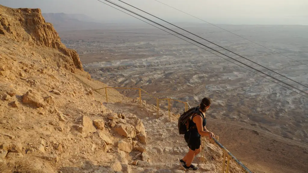 Wil je van de zonsopkomst bij Masada genieten? Dan moet je er vroeg bij zijn. De poort van Snake Path gaat open om 5.15 uur. De entreeprijs is 28 shekel voor volwassenen, 24 shekel voor studenten. Je hebt hierna ongeveer een uur om naar boven te wandelen voordat de zon verschijnt. De wandeling via Snake Path is slechts 2 kilometer, maar het pad brengt je wel 400 meter omhoog, naar de top van de rots. Door de steile klim en de tijdsdruk is het nog best een pittige wandeling. Je kunt na de zonsopkomst en het bekijken van de ruïnes besluiten om weer naar beneden te wandelen via hetzelfde wandelpad of om te wachten totdat de kabelbaan in werking is.