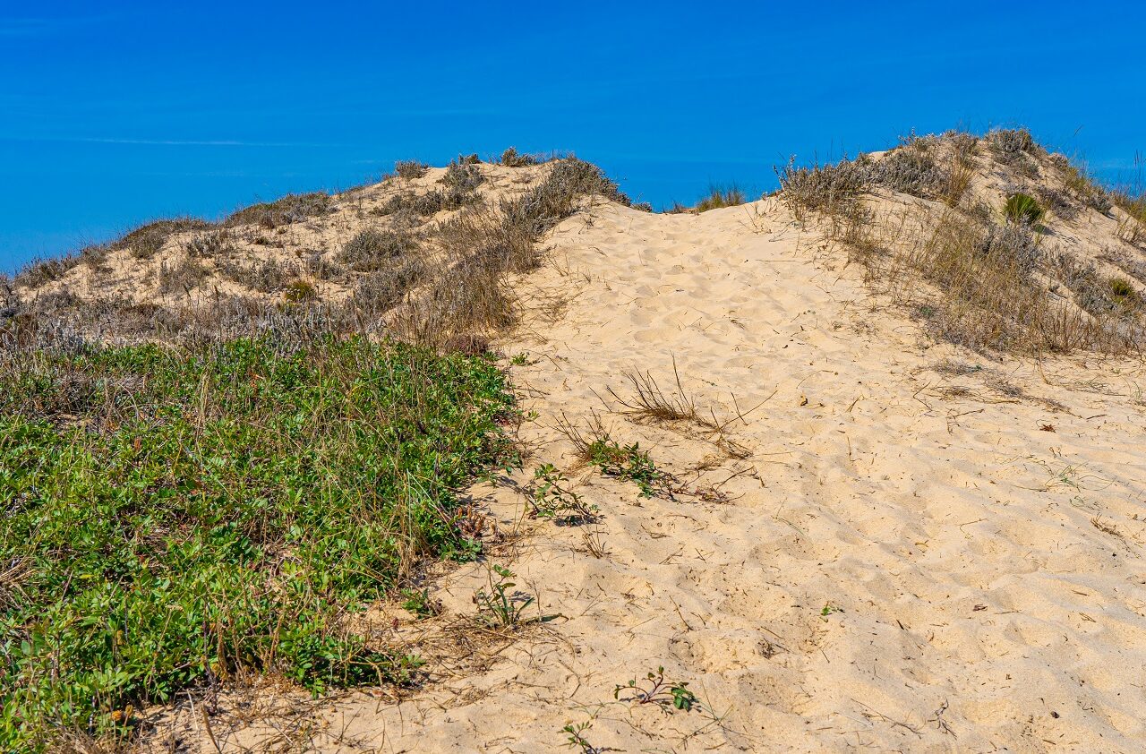 De eerste dag van Porto Covo naar Vila Nova de Milfontes is misschien wel de zwaarste etappe tijdens de Fisherman‘s Trail. Nadat je het mooie Porto Covo met de wit-blauwe huisjes achter je hebt gelaten is het 20 kilometer lang ploeteren door het zand en de duinen. In het begin probeer je constant het zand uit je schoenen te schudden, maar na een tijdje kom je erachter dat dat toch geen zin heeft. Je schoenen zitten binnen een paar stappen toch weer vol met zand.