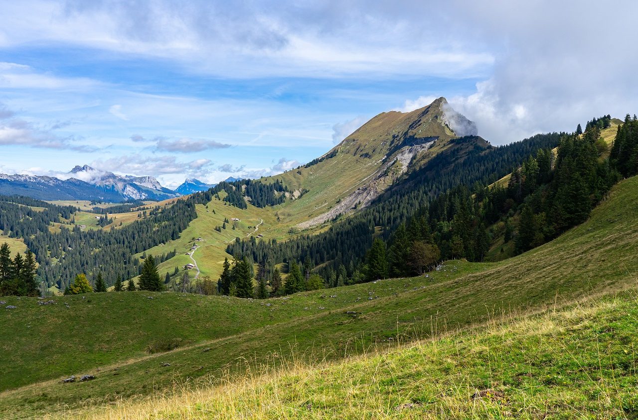 Tussen Roteflue en Schonbuel is het grotendeels weiland met weidse uitzichten. Ik wandel door een stuk weiland en hoor de koeien met hun bellen lager in het dal. Het loopt lekker door op dit stuk. Ik prop wat eten naar binnen en maak me klaar voor de volgende klim: naar de top van de Suggiture, op 2085 meter hoogte.