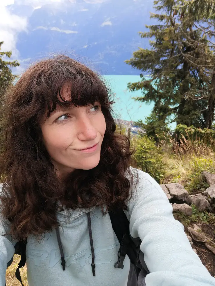 Maar dan na een uur wandelen duikt er iets magisch op: een doorkijkje door de bomen geeft me uitzicht op de turquoise Brienzersee. Na 10 seconden verdwijnt het weliswaar weer, maar het geeft me hoop. Op de bergrug ga ik prachtige uitzichten hebben, zonder mist!