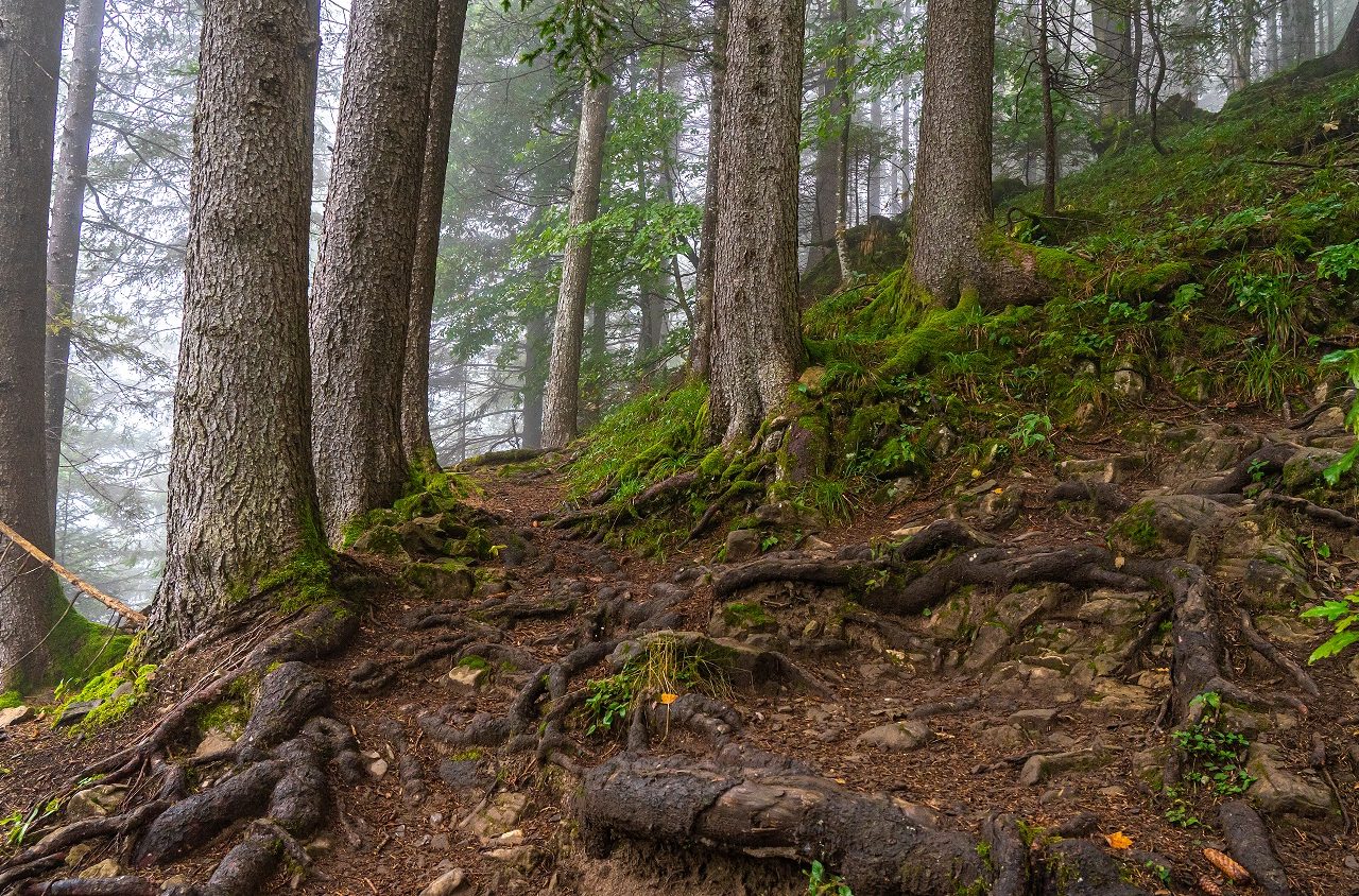 Interlaken ligt op 568 meter hoogte, dus het is nog wel even doorklimmen naar Harder Kulm, dat op 1321 meter hoogte ligt. De wandelroute stijgt constant, maar lichtjes. Hierdoor is het een goede opwarming voor m’n spieren. Grindpaden wisselen elkaar af met onverharde zandpaden die worden versterkt door oude boomwortels. Na een half uur kom ik aan bij het eerste uitzichtpunt over Interlaken en niet veel later zie ik een boerderij met een drinkfontein.