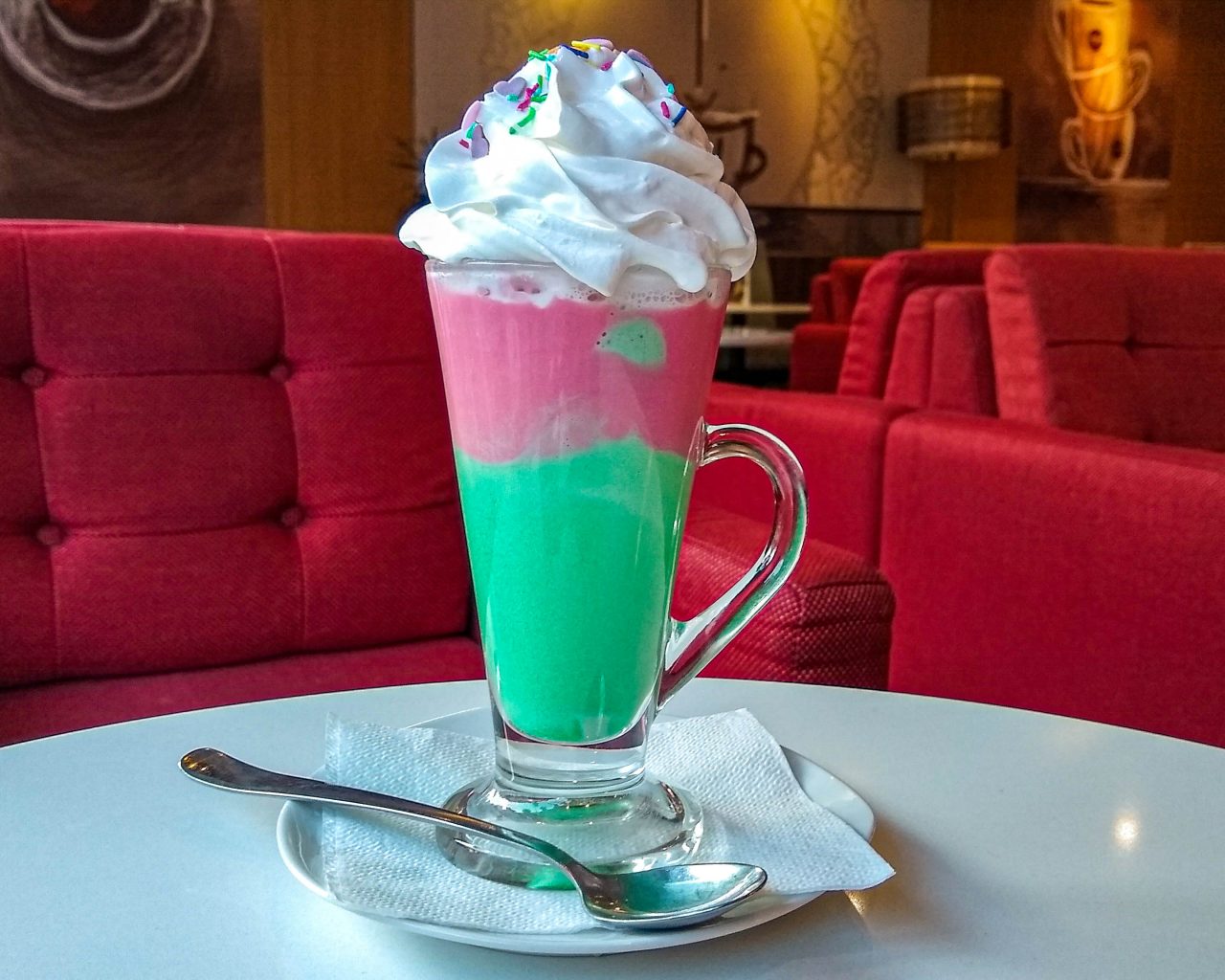 Bistro Weiss is een koffiezaak waar je normale koffie en cappuccino kunt bestellen. Maar je kunt hier ook voor iets geks gaan. Zoals een gedecoreerde frappuccino of een freak shake. Ik vind de freak shakes iets te heftig en ook te duur, daarom nam ik een Hot Choco Rainbow. Een warme chocolademelk, al smaakte het meer als een bubblegum drankje. Maar wel leuk om iets nieuws te proberen! Het ziet er sowieso goed uit op instagram en het is perfect voor mensen die van zoetigheid houden.