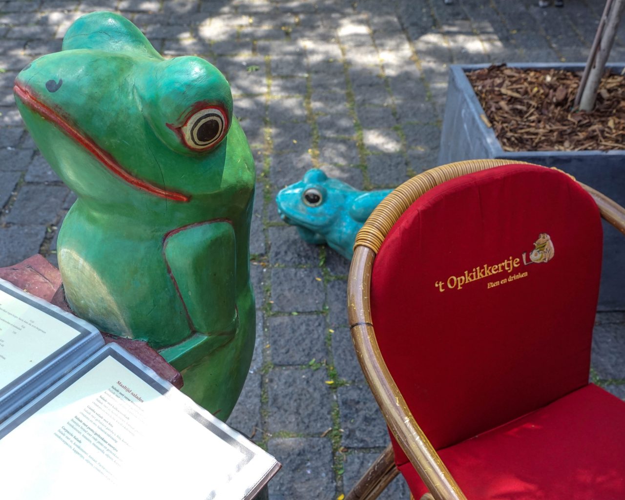 Binnen/buiten: ik zou je aanraden om lekker buiten op het terras van ’t Opkikkertje te zitten, maar wel binnen de vele kikkers even bewonderen!