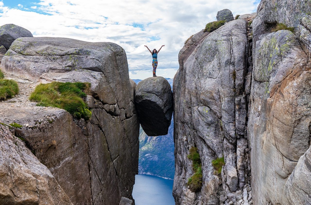 De wandeling naar Kjeragbolten was een van mijn favoriete wandelingen in Noorwegen. Deze wandeling heeft prachtige uitzichten over het Lysefjord en brengt je uiteindelijk naar een groot rotsblok dat vastzit tussen 2 kliffen: de Kjeragbolten. Als je erop staat zweef je zo’n 1000 meter boven het indrukwekkende fjord!