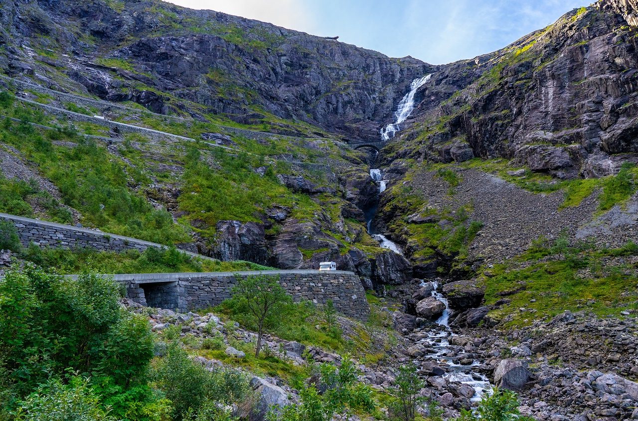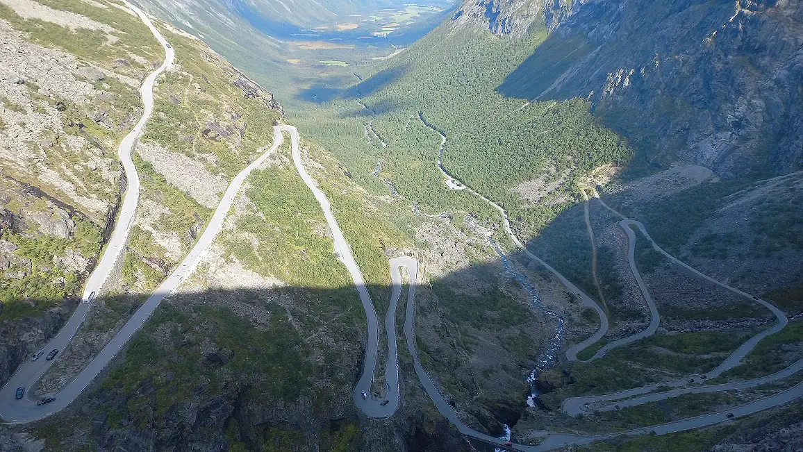 “Het gaat om de reis, niet om de bestemming”. Die quote is zeker van toepassing op de Trollstigen. Wie van Andalsnes naar Geiranger reist, volgt autoweg 63. Een deel van deze autoweg wordt de Trollstigen genoemd, oftewel de Trollenladder. Dit is een imposante weg door de bergen met heel wat haarspeldbochten. Bij de top van Trollstigen is een parkeerplaats met een uitzichtpunt over de vallei, watervallen en de Trollstigen.