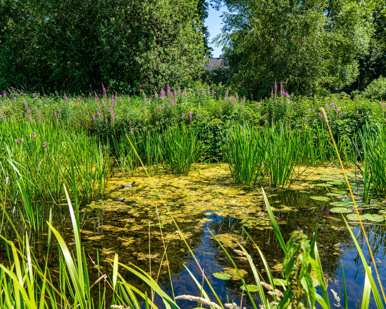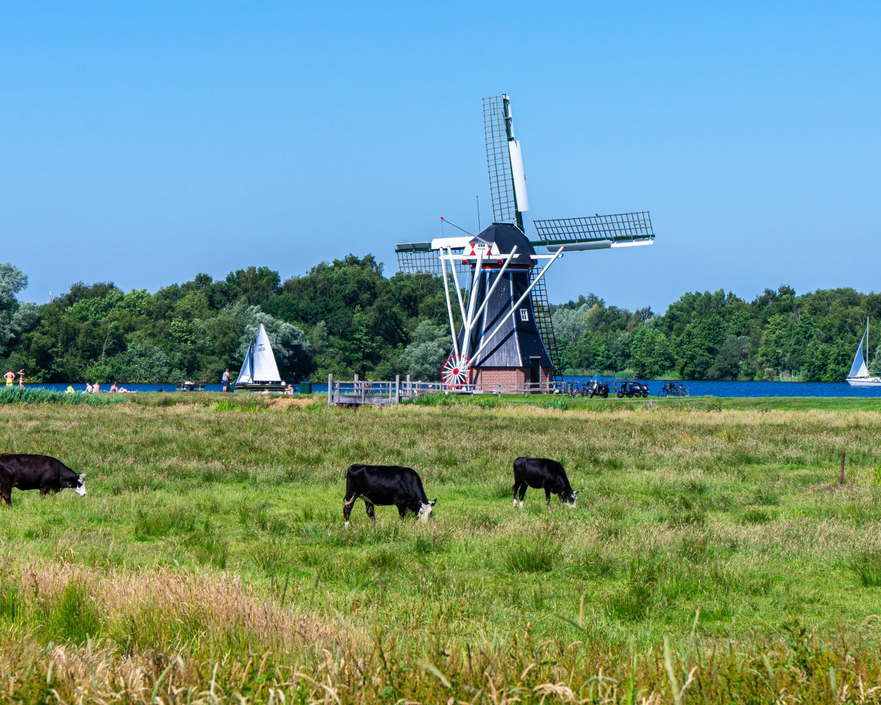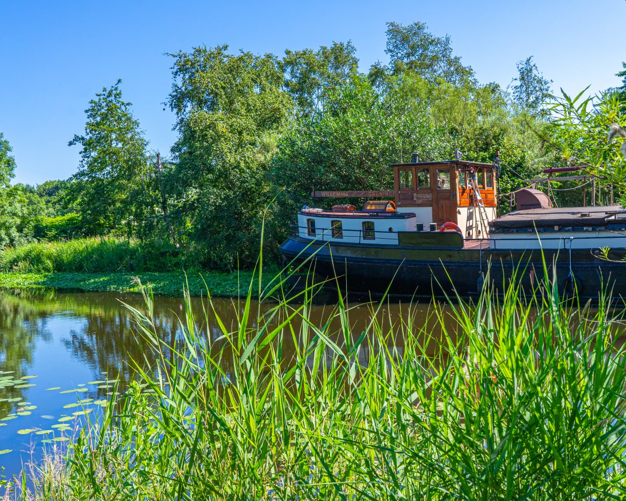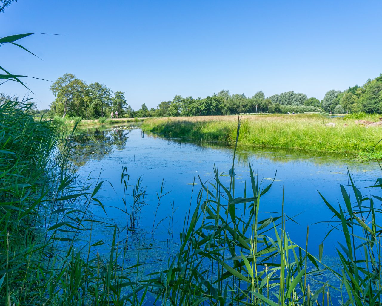 Eigenlijk had ik eerder willen vertrekken, maar het maakt niets uit. Ik heb zeeën van tijd – en zelfs aan de tijd heb ik geen verplichtingen. Ik wandel langs verlaten woonboten, terwijl het luide gekwaak van kikkers verandert in vaag achtergrondgeluid. Langs reigers die naar hun spiegelbeeld in het water staren. Niet veel later zie ik Molen De Helper aan het water tussen de bladeren verschijnen. Bij de Nijveensterbrug staan een paar oudere mannen met elkaar te praten. Een hond met zwarte en witte vlekken springt vrolijk om hen heen.