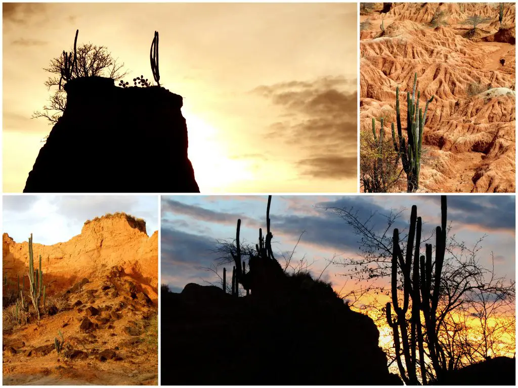 Aansluitend op reisfotografie tip 5: speel niet alleen met de sluitertijd van de camera, maar ook met licht en kleuren. Mijn favoriete uur om te fotograferen is de zonsondergang (en als ik vroeg uit mijn bed kom: de zonsopkomst). Het moment dat de zon richting de horizon zakt en de wereld een oranje gloed krijgt is altijd magisch. Fotografen noemen dit ook wel the golden hour. Hieronder zie je foto’s van de Tatacoa woestijn in Colombia, gemaakt op verschillende momenten gedurende de dag.