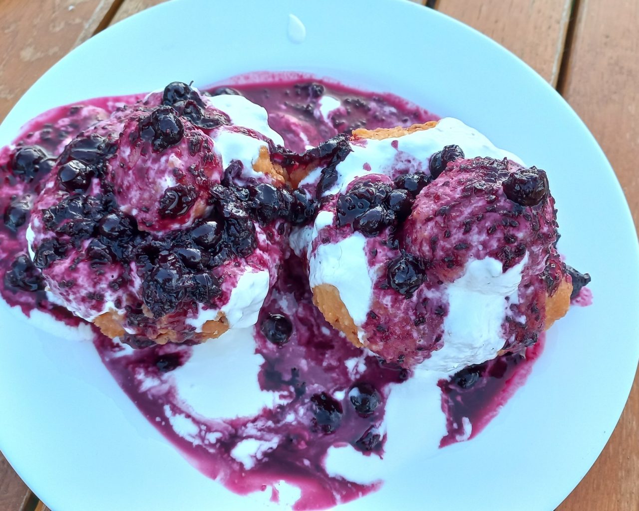 Het meest bekende dessert in Roemenië is papanasi… en het is vegetarisch! Je spreekt het uit als ‘papanash’, want de -i aan het einde van een woord wordt in het Roemeens niet uitgesproken. Het heeft veel weg van een oliebol. Papanasi is een gefrituurde deegbol die is gevuld met zachte kaas. Bovenop worden zure room, jam en bosvruchten of kersen geserveerd.