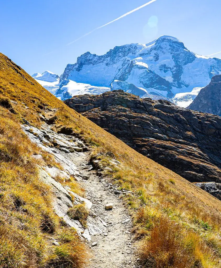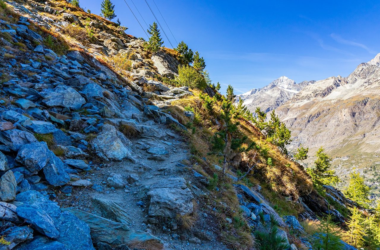 Als je uitstapt bij station Riffelalp wandel je in 10 minuten naar een paar restaurants die bij dit station horen. Hierna loop je een heel stuk via de Mark Twain trail richting Rotenboden. Het wandelpad begint vlak en gemakkelijk. Onverharde zandpaden wisselen vervolgens af met kleine stukjes klimmen via grote stenen. Meerdere keren word je getrakteerd op uitzichten op de bijzondere Matterhorn. Dat uitzicht gaat niet vervelen. Overigens zie je tijdens de wandeling meer vierduizenders: bergtoppen die meer dan 4000 meter hoog zijn.