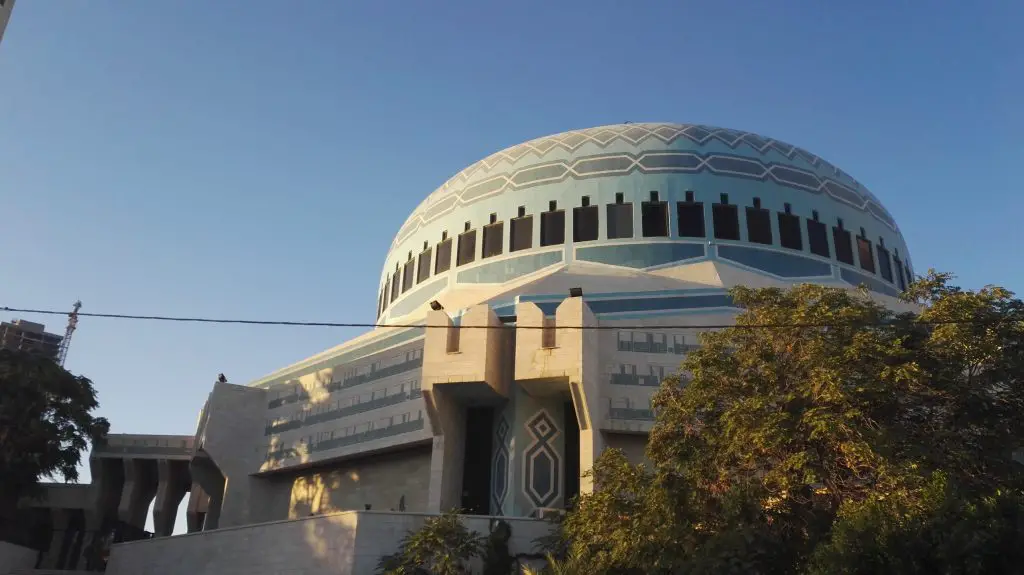 Een indrukwekkend bouwwerk is de King Abdullah I Moskee. De koepel is prachtig en helemaal belegd met blauwe en witte steentjes. Dit is de enige moskee in Amman waar ook niet-moslims naar binnen mogen gaan. Ik heb eerlijk gezegd geen idee of er een entreeprijs is: ik ging namelijk gratis naar binnen, maar andere mensen zeiden dat ze voor 2 JD een ticket moesten kopen.