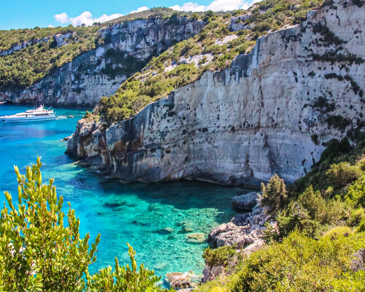 Er is geen gebrek aan mooie stranden op Zakynthos. Je kunt het beste met een huurauto op pad om de minder toeristische stranden te bezoeken. Denk aan Xigia Beach, een kiezelstrand dat verborgen ligt tussen de kliffen aan de oostkust van Zakynthos. De kleur van het water loopt van melkachtig wit over in turquoise. De witte kleur dankt het zeewater aan de collageen die vanuit de rotsen in het water terechtkomt. Collageen schijnt goed voor de huid te zijn (minder rimpels), dus dat is wel leuk. Het zeewater voelt daardoor een beetje vettig aan. Minder leuk is de zwavelgeur, want het zeewater bevat ook zwavel. Zwavelhoudend water is goed voor de huid en de gewrichten, maar de geur van rotte eieren is minder fijn voor je neus. Het is een klein strand, maar je vindt hier wel een paar parasols en strandbedjes.